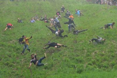 VIDEO: Tako boleči so trenutki, ko norci po strmem bregu tečejo za kolesi sira