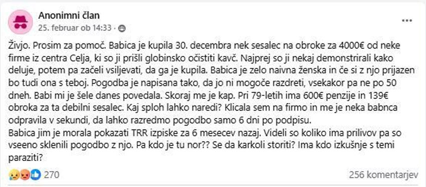 "Živjo. Prosim za pomoč. Babica je kupila 30. decembra nek sesalec na obroke za 4000€ od neke firme iz centra Celja, ki so ji prišli globinsko očistiti kavč. Najprej so ji nekaj demonstrirali, kako deluje, nato so ji ga začeli vsiljevati, da ga je kupila. Babica se zelo naivna in če si z njo prijazen, bo tudi ona s tabo. Pogodba je napisala tako, da je ni mogoče razdreti, vsekakor pa ne bo petdesetih dneh," je v začektu zapisala zaskrbljena vnukinja.