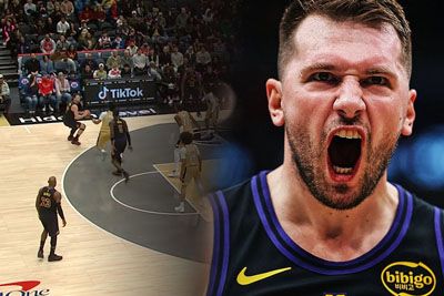 Luka Dončić doživel grd padec: Skakal na nogi in padel čez rob igrišča