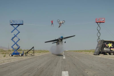Prvi trik na svetu, ko je pilot akrobatskega letala poletel pod vrvohodcem in motokrosistom