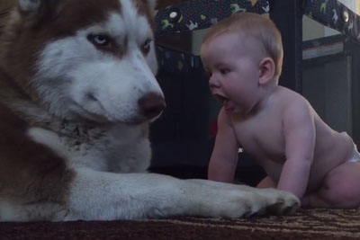 Dojenček in kuža si izkazujeta medsebojno ljubezen