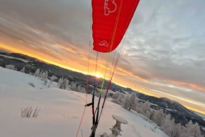 VIDEO: Padalec iz Slovenije ob sončnem zahodu poletel nad zasneženo pokrajino
