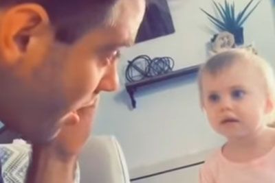 Smešen odziv malčice, ko se oče pretvarja, da govori z njenim fantom