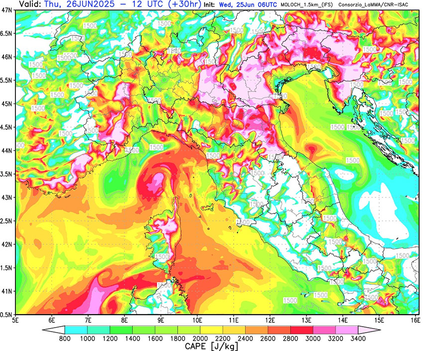 Italijanski mediji poročajo, da danes predvsem za sever Italije velja veliko tveganje za nastanek hudih neviht. Med popoldanskim in večernim časom naj bi se razvile nevihte, ob katerih bi lahko padala debela toča, lokalni sunki vetra pa bodo presegali 100 km/h. Ob napovedi so objavili tudi fotografijo razpoložljive konvektivne potencialne energije, ki velja za enega glavnih pokazateljev atmosferske nestabilnosti. Več kot je te energije v zraku, bolj močna so na omenjenem območju nevihte. Skrbi nas lahko predvsem dejstvo, da je omenjene energije danes veliko tudi na območju celotne zahodne Slovenije.