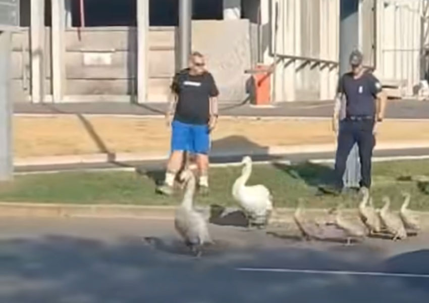 Prizor so včeraj popoldne posneli na Piranski cesti v Kopru, ko je skupina labodov iz smeri rekreativnih površin krenila proti Centralnemu mestnemu parku. Ker je bila vmes zelo prometna cesta, so tamkajšnji krajani zaustavili promet, nato pa labodjo družino s šestimi mladički varno pospremili do parka.
