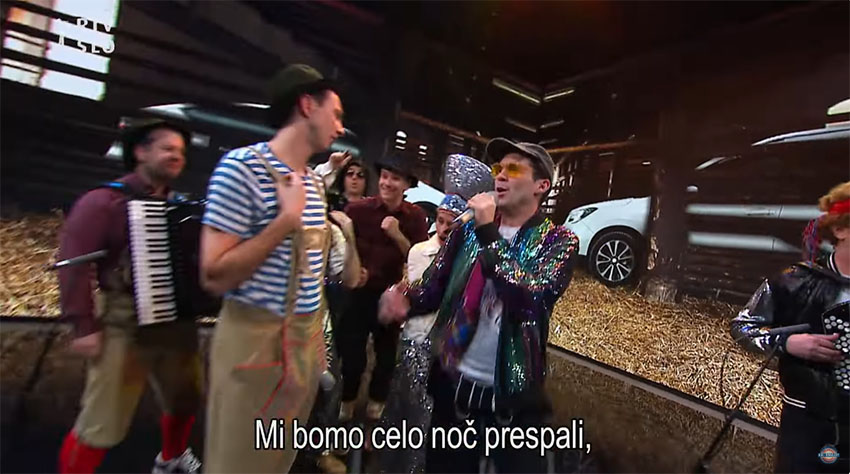Narodno-zabavni dvoboj so poimenovali Viž Off, pri parodiji pa sta glavni vlogi odigrala Tilen Artač in Robert Petan. Slednji se je predstavil kot lastnik prvega električnega avtomobila Loyz-e Teslak, ki ga je spremljal kolega iz Ansambla Bratje iz polnilnice, Tilen Artač pa je se je predstavil kot solastnik bencinskega servisa in sin lokalnega mehanika po imenu Alfa Nipič. Nastop je spremljal njegov bratranec iz Ansambla Dizel in zlati zvoki.