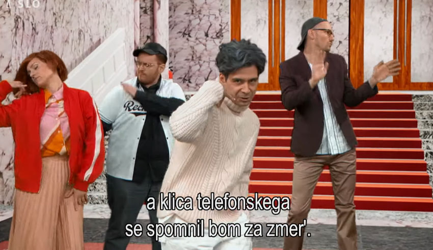 Tilen Artač se je tokrat predstavil kot slovenski poslanec Luka Mesec, na odru pa v družbi sodelavcev zapel svojo novo pesem.