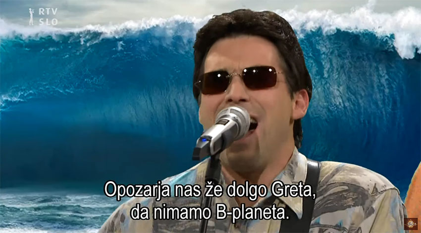 Privoščil si je aktualne klimatske spremembe, ki smo jih mnogi Slovenci občutili tudi v preteklih dneh ob slovenski obali. "Ko butne morje čez obalo, jaz bežal bom s tabo," se sliši začetek parodije, ki jo je v satirični oddaji Kaj dogaja? Z Jonasom prepeval Tilen Artač.