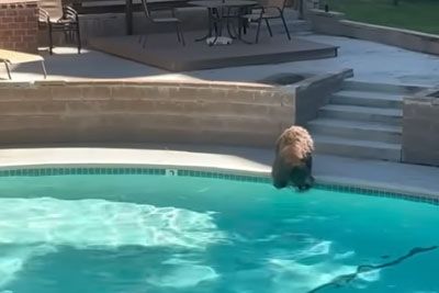 Medved si je zaželel osvežitve, nato je zaplaval v bazenu