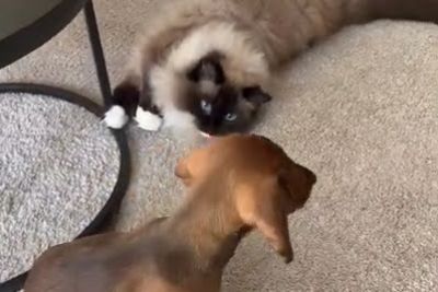 Mačka je v hiši srečala pasjega mladička: Takšen prizor je posnela lastnica!