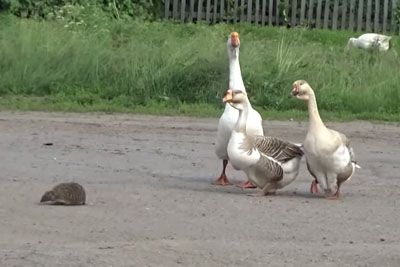 Ježek je hotel prečkati cesto: Poglej, kako so ga varovale goske!