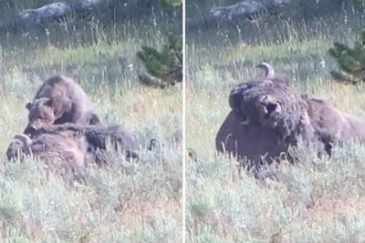Lačni grizli mrtvega bizona premaknil, kot bi bil otroška igračka