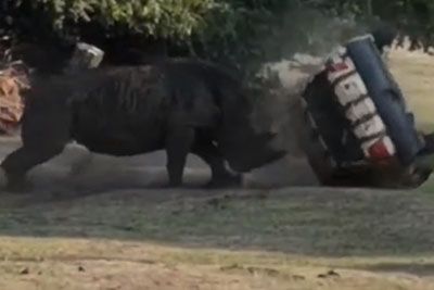 Jezni nosorog pokazal svojo moč: Tako je v živalskem vrtu prevrnil vozilo!