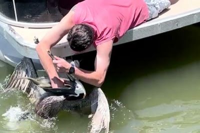 Moški pelikanu rešil življenje: Pojesti je želel veliko ribo z zapičenim trnkom!