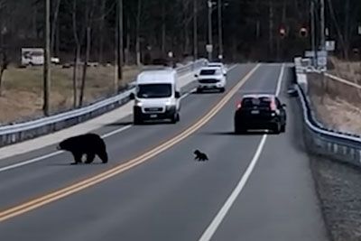 Mama medvedka mladičku pomagala, da je varno prečkal cesto