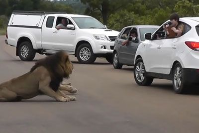 Lev turistom pognal strah v kosti: To je razlog, zakaj ostati v avtomobilu!